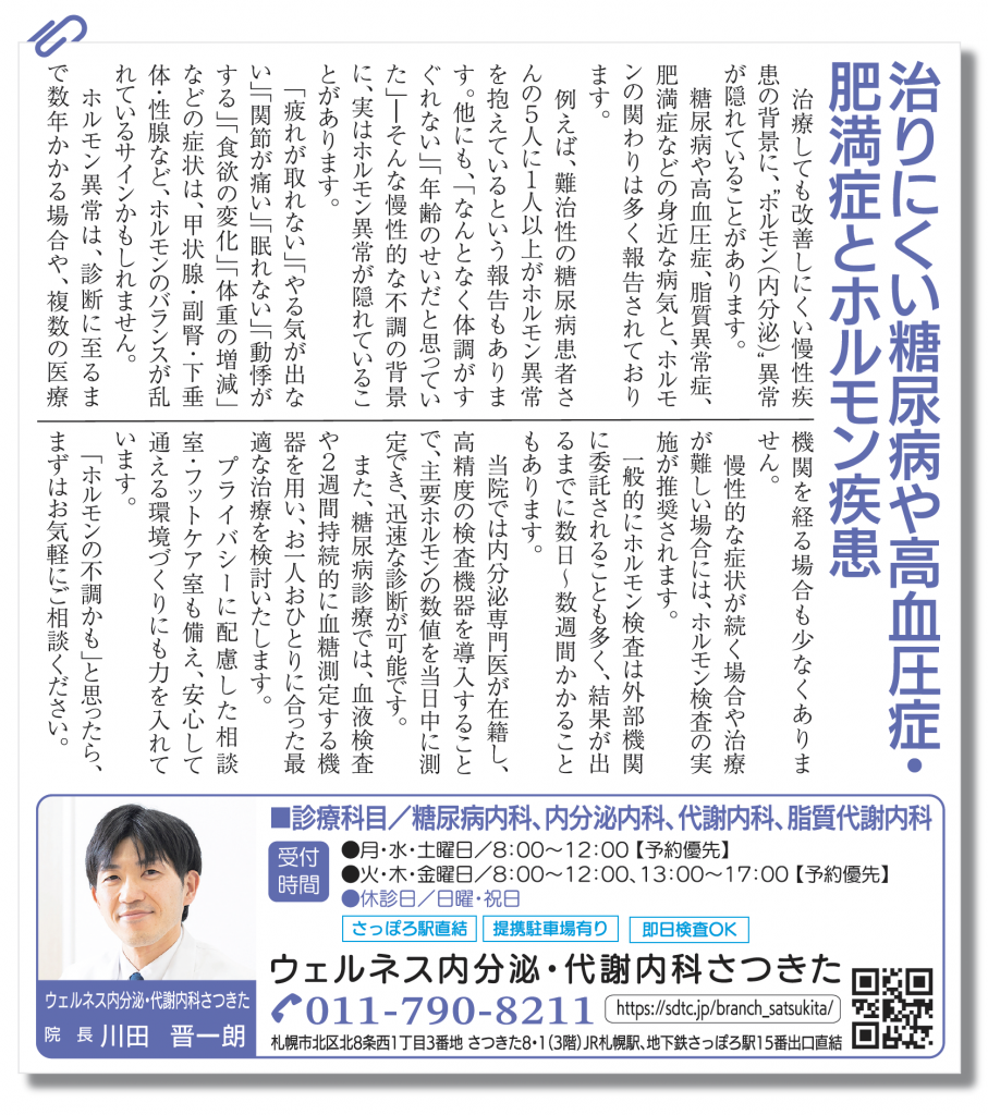 慢性疾患とホルモンの関わりについて、「ウェルネス内分泌・代謝内科さつきた」の川田院長の記事が北海道新聞に掲載されました。ぜひご覧ください。